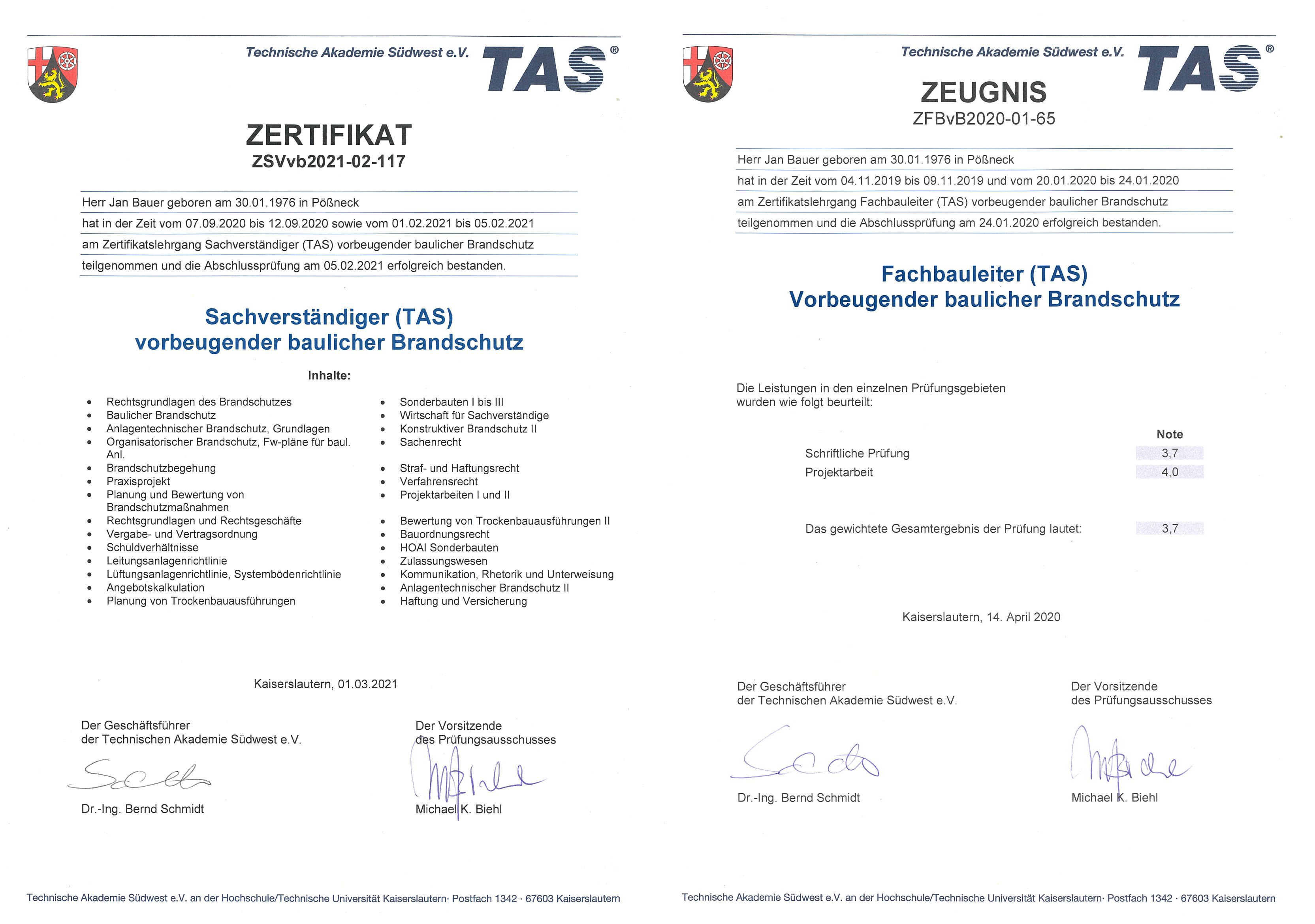 Unsere Zertifizierungen (Geschäftsführer Jan Bauer):